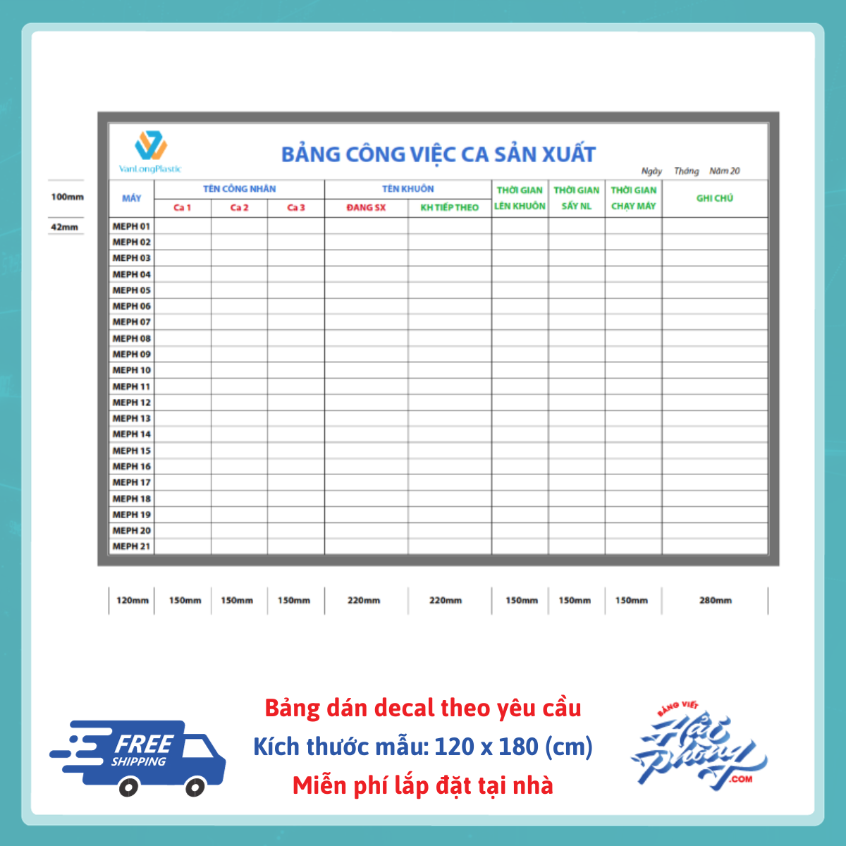 Dán decal bảng ca sản xuất theo kiểu decal cắt chữ và đường kẻ line trên bề mặt bảng từ trắng hoặc bảng xanh tùy chọn. Decal cắt chữ là dạng decal cắt từng chữ và dán lên mặt bảng. Loại decal này chỉ phù hợp với các kích thước bảng to và chữ to mới có thể dán được. Nếu chữ quá nhỏ, hay chữ Hàn Quốc, Trung Quốc thì không thể dán loại decal này.