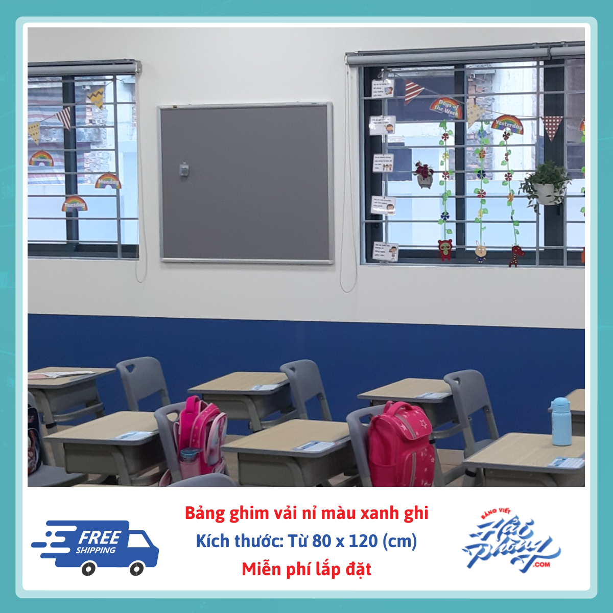 - Phòng học cần treo tranh ảnh, bài học: bảng ghim nỉ là 1 trong các sản phẩm được yêu thích trong các nhà trường. Bảng ghim nỉ treo tường được sử dụng để ghim những bức ảnh sáng tạo vào những dịp lễ kỷ niệm của lớp, của trường
