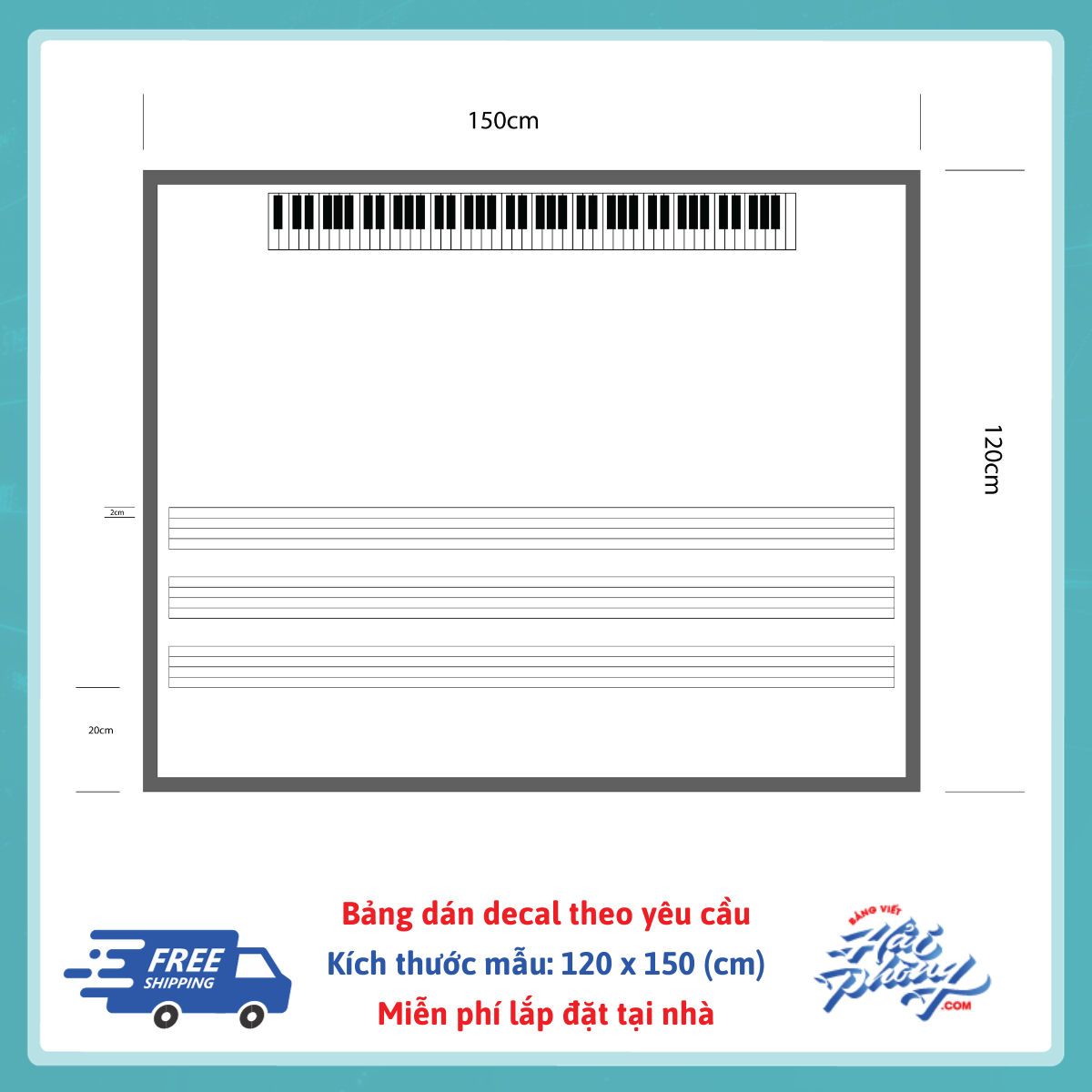 Dán decal bảng khuông nhạc theo kiểu decal cắt chữ và đường kẻ line trên bề mặt bảng từ trắng hoặc bảng xanh tùy chọn. Decal cắt chữ là dạng decal cắt từng chữ và dán lên mặt bảng. Và loại decal này là đơn sắc chứ không tin dược theo màu của yêu cầu của mình.