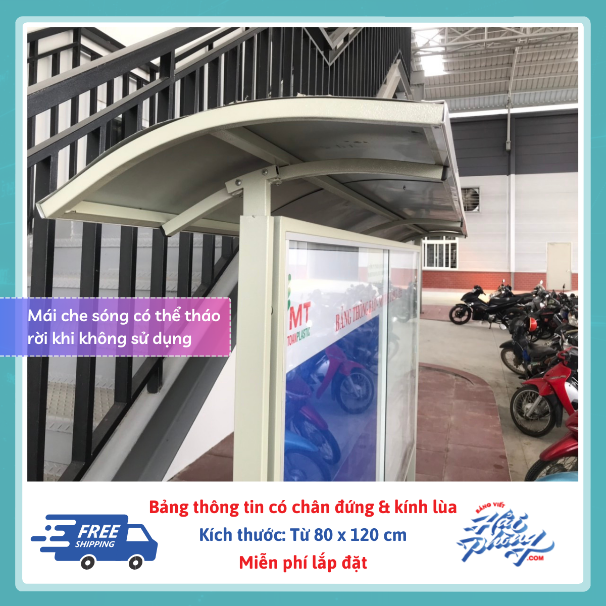 - Mái che dạng lượn sóng: hạn chế nhất tác động của gió đến bảng thông tin ngoài ra còn hạn chế khi mưa xuống nước chảy thẳng vào bề mặt bảng.