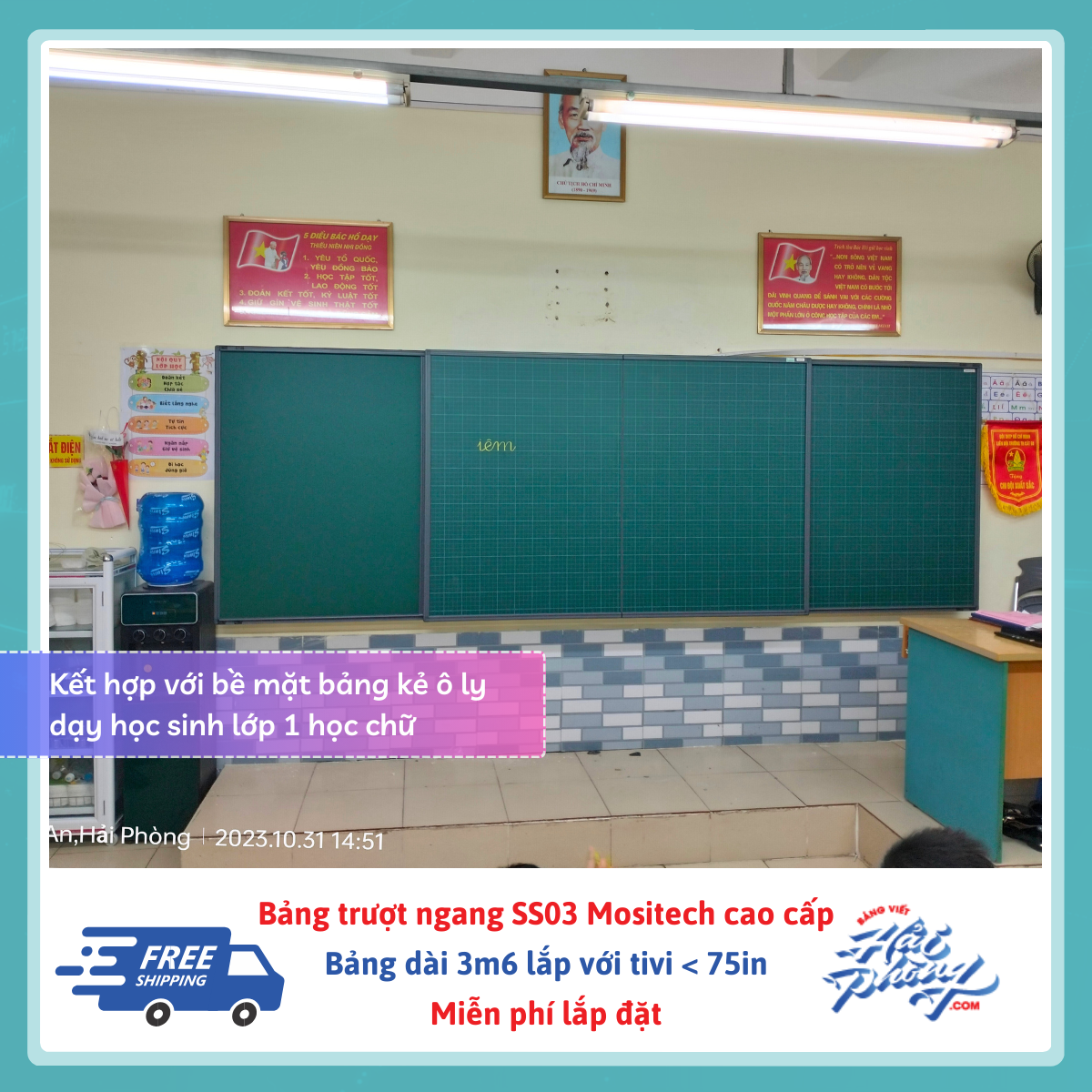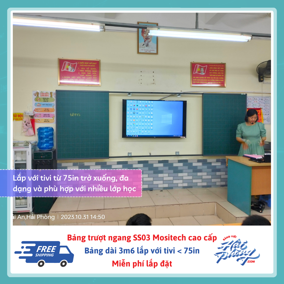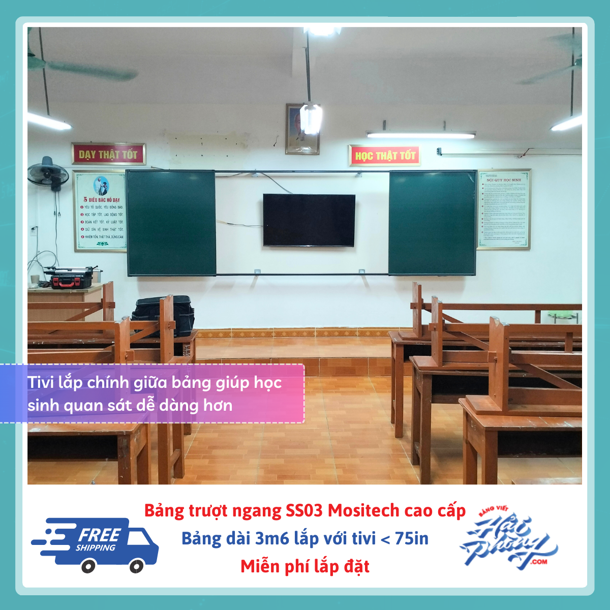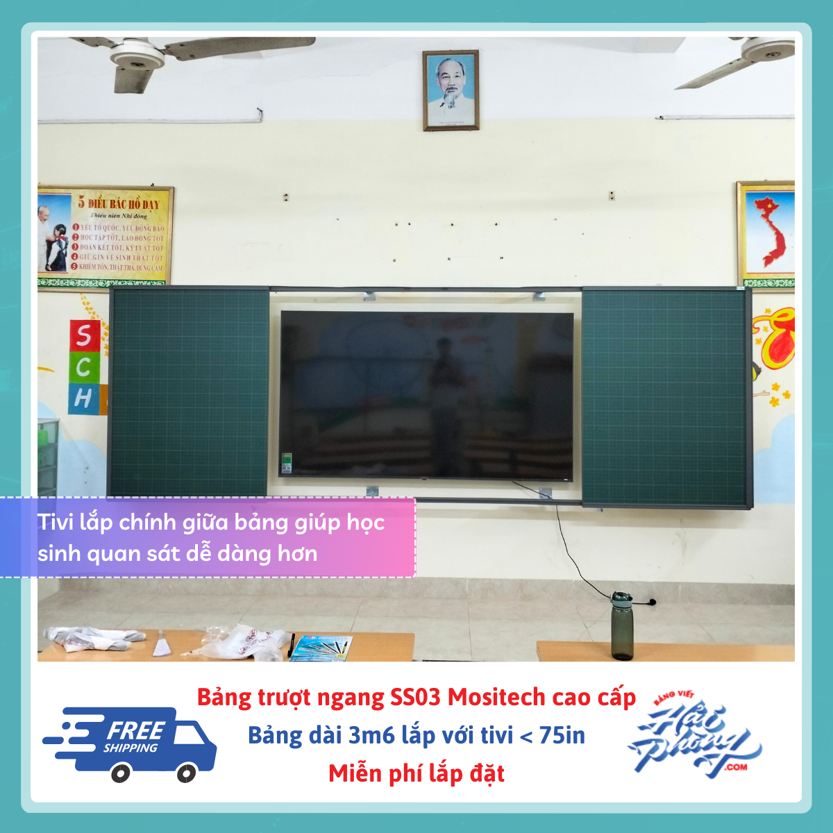 Bảng trượt ngang 4 tấm (gồm 2 tấm trượt, 2 tấm cố định) dài 3m6 – Tivi 75in